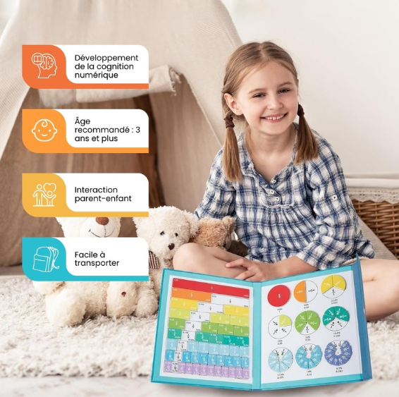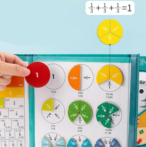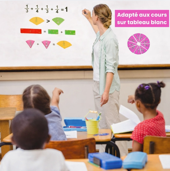 Conçu pour s’adapter aux cours sur tableau blanc, ce support magnétique permet aux enseignants de présenter les fractions de manière claire, visuelle et interactive.