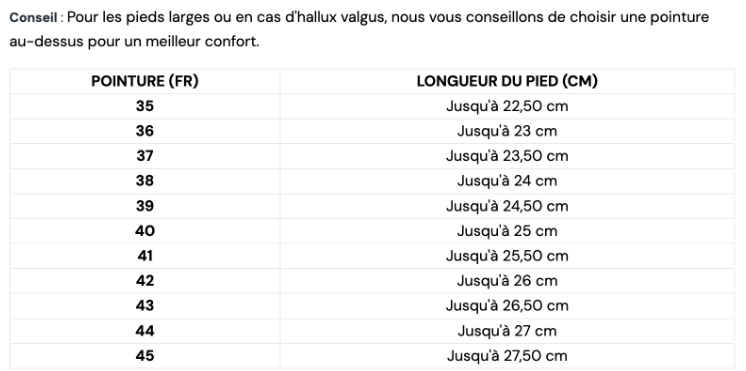 Un guide des tailles est disponible pour vous aider à faire le bon choix.