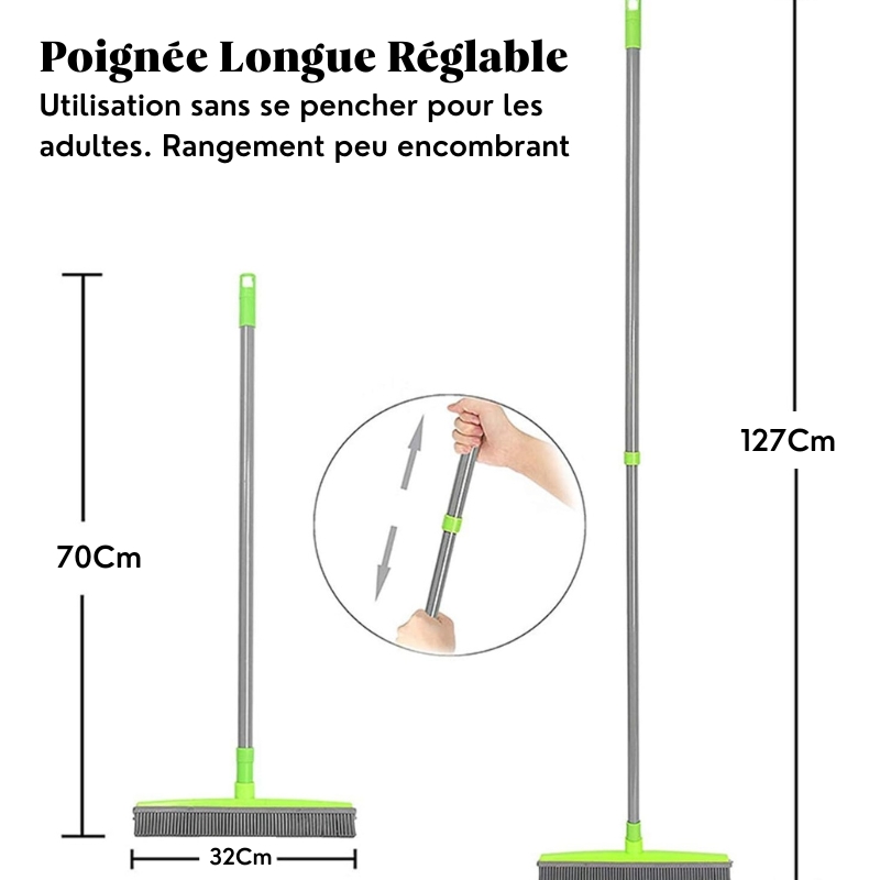 Grâce à sa tête en caoutchouc souple, ce balai attire et retient la saleté au lieu de la disperser comme les balais classiques. Les brins en caoutchouc créent une adhérence électrostatique naturelle qui emprisonne efficacement poils d’animaux, cheveux, miettes et poussière. Il est particulièrement redoutable sur les tapis, moquettes et surfaces où même l’aspirateur échoue.