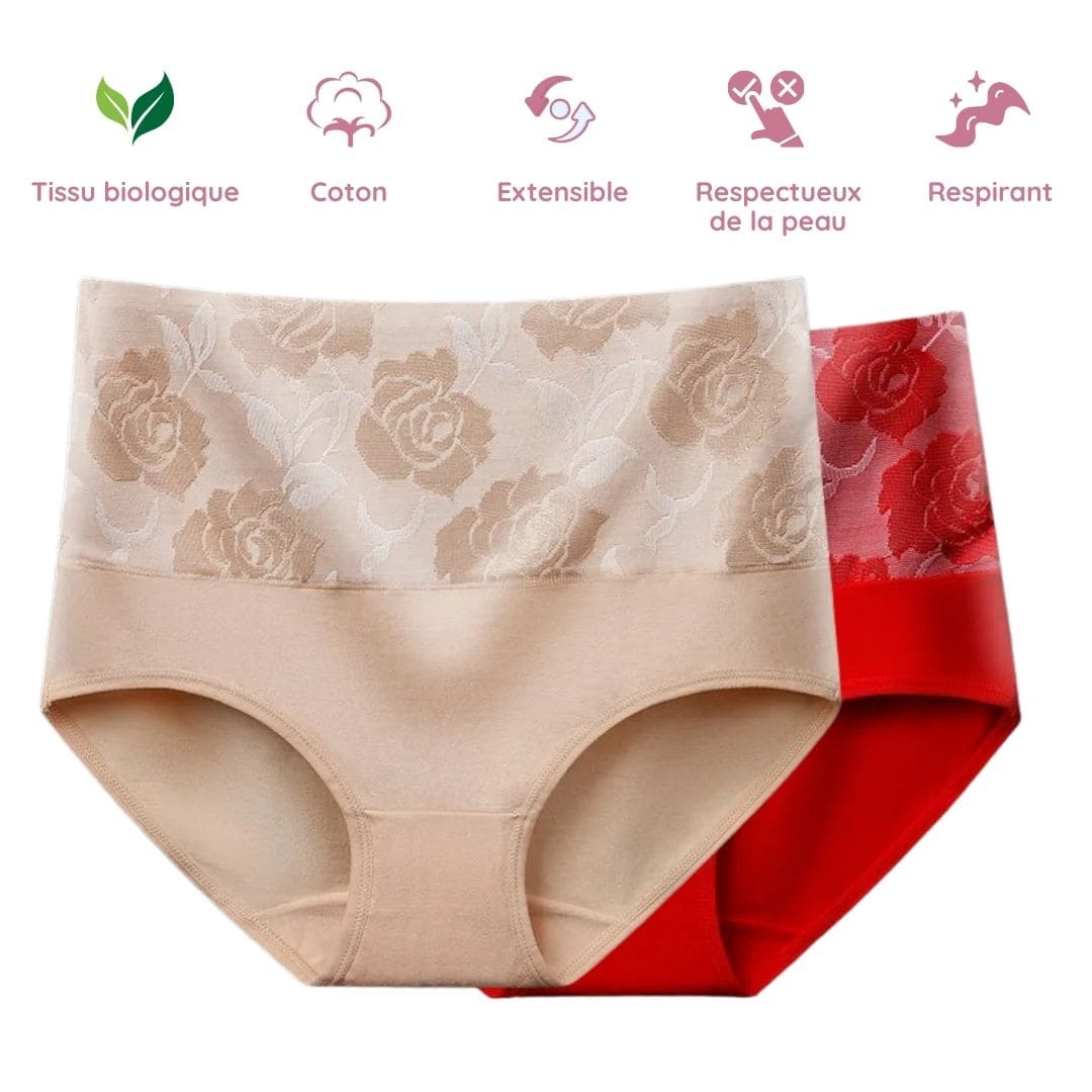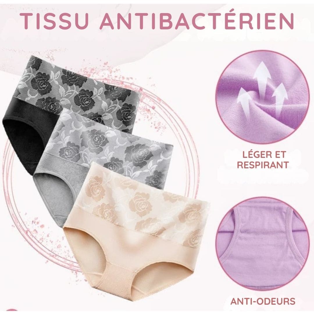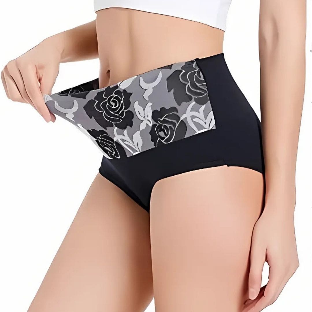 Cette culotte taille haute gainante anti‑fuites répond à vos besoins : elle offre à la fois un effet ventre plat, une absorption discrète et un joli motif floral pour être élégante même sous vos vêtements.