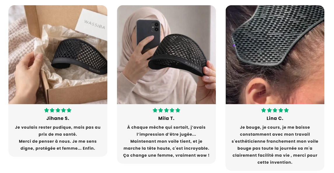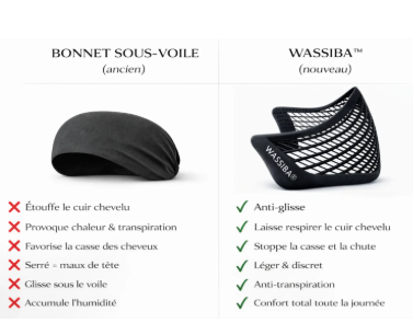 WASSIBA répartit la pression, protège tes tempes, empêche la glisse et laisse tes cheveux respirer, même quand tu bouges ou ajustes ton voile.
